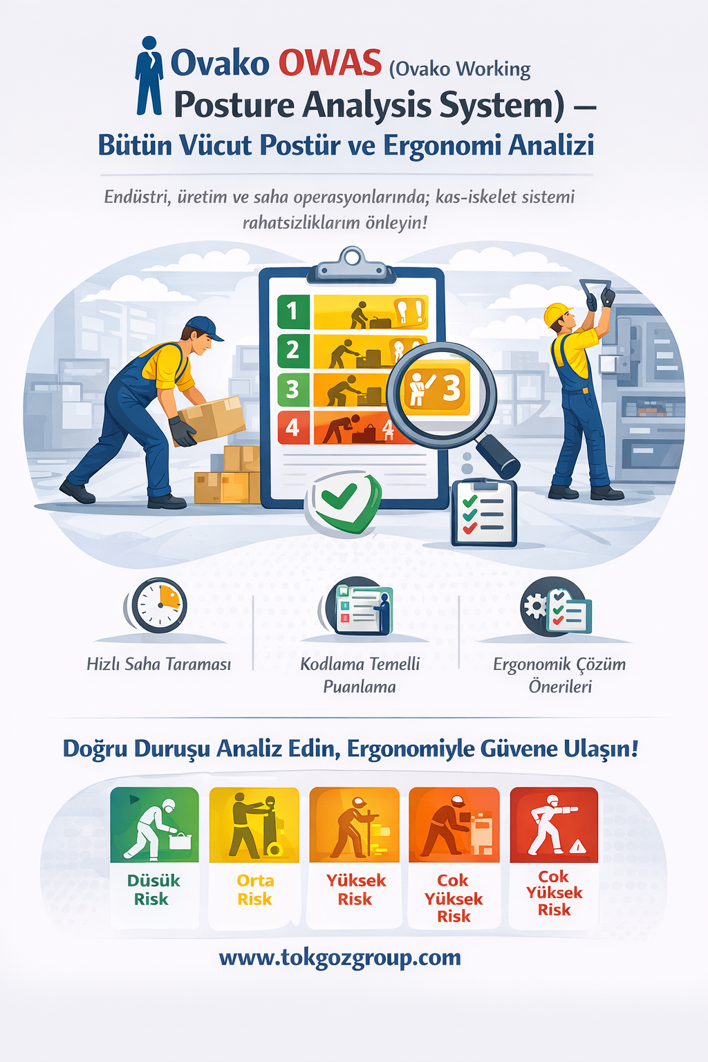 OWAS (Ovako Working Posture Analysis System), çalışanların maruz kaldığı bütün vücut postür risklerini hızlı ve sistematik biçimde analiz etmek için geliştirilmiş güvenilir bir ergonomi yöntemidir. Tokgöz Ergonomi olarak OWAS metodolojisini saha gerçekleriyle birleştiriyor, ölçülebilir risk skorları ve uygulanabilir iyileştirme planları sunuyoruz.