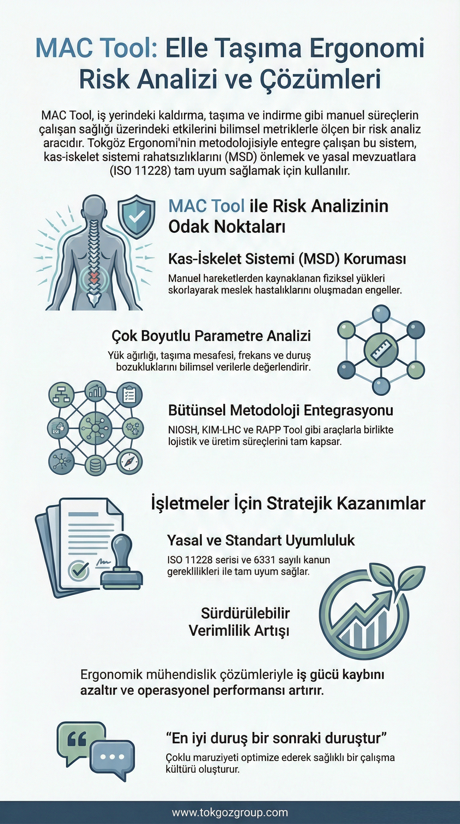 MAC Tool, Tokgöz Ergonomi’nin “en iyi duruş bir sonraki duruştur” felsefesi çerçevesinde, manuel görevlerde çalışanların maruz kaldığı fiziksel yükü bilimsel metriklerle ölçen ve yasal ile sağlık parametreleri çerçevesinde optimize eden vazgeçilmez bir karar destek aracıdır.