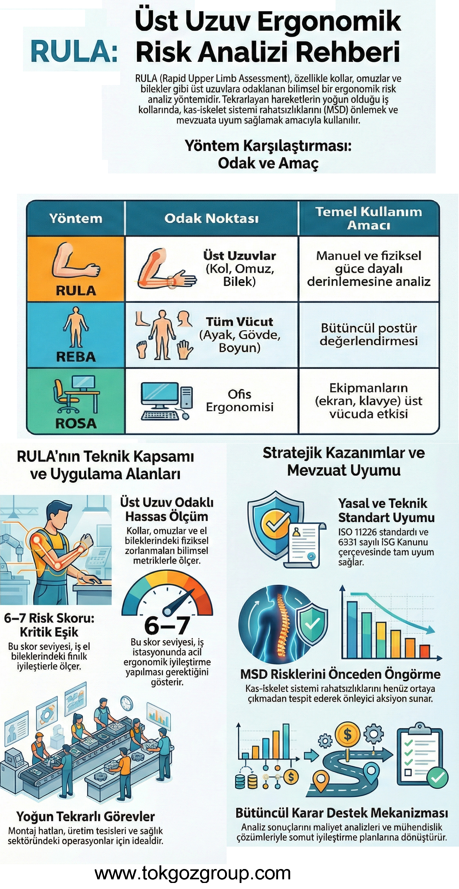 RULA kullanımı, iş sağlığı ve güvenliği mevzuatına tam uyumlu bir çerçevede uygulanır ve işletmelere somut kazanımlar sağlar.