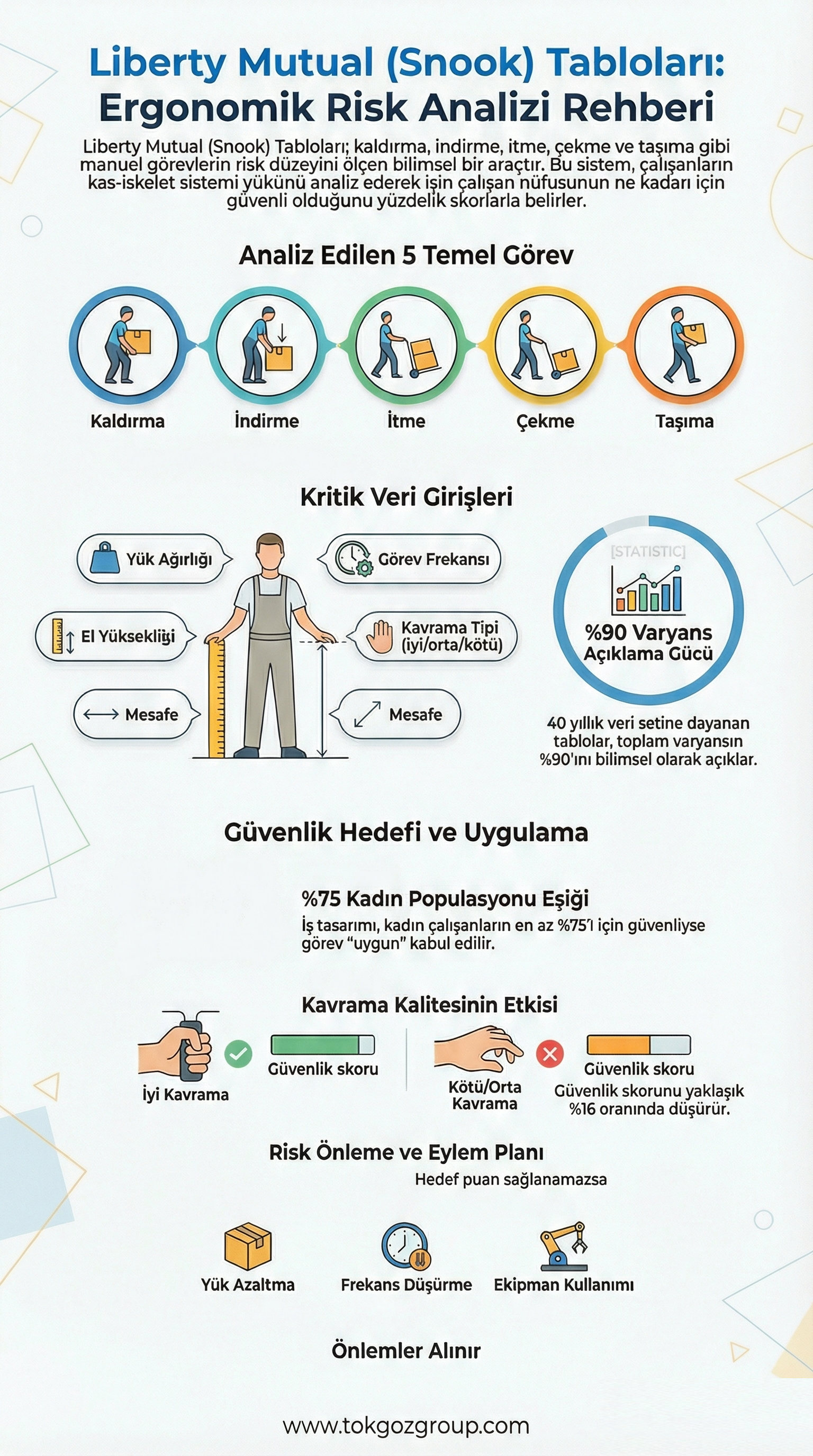 Snook-Liberty Mutual Tabloları, kaldırma, taşıma, itme ve çekme görevlerinde güvenli sınırları popülasyon yüzdesine göre belirleyen güçlü bir ergonomi aracıdır. Tokgöz Ergonomi olarak bu yöntemi, iş gücünüzün tamamını kapsayan sürdürülebilir ve ölçülebilir çözümlere dönüştürüyoruz.